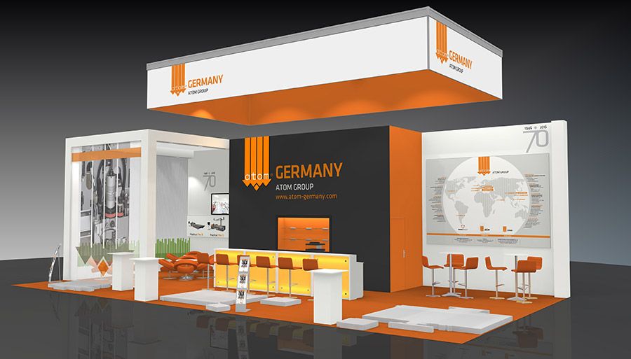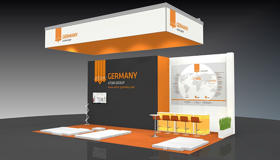 Aufgrund der Vielzahl an Messen, die ATOM in einem Jahr besucht, macht es Sinn ein Konzept zu entwickeln, dass sich auf den verschiedenen Messen variable und dennoch individuell einsetzen lässt. Wichtig hierbei ist, dass der Stand trotz der wechselnden Ausrichtung und Größe, seine Wiedererkennung und Funktionalität nicht verliert.
